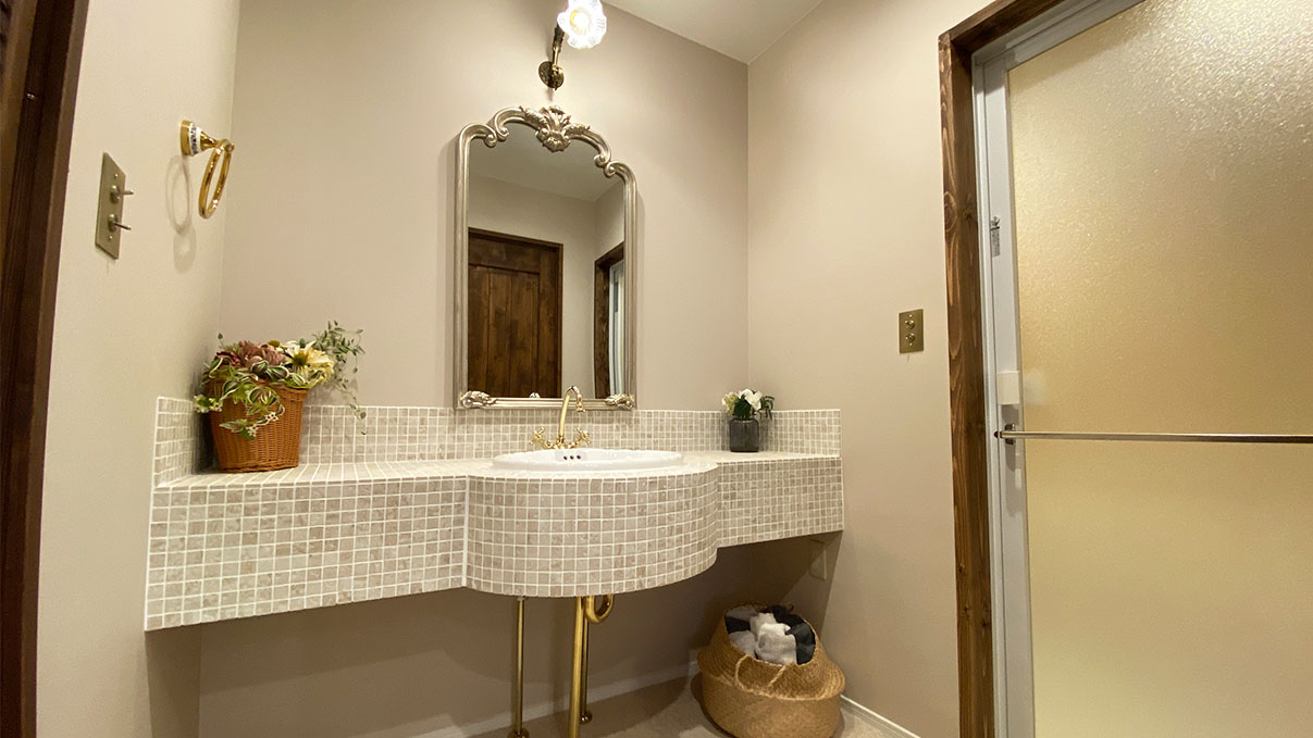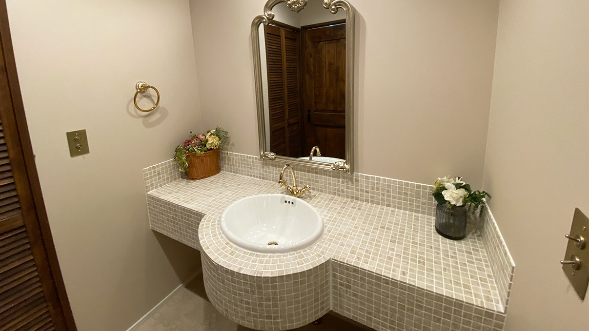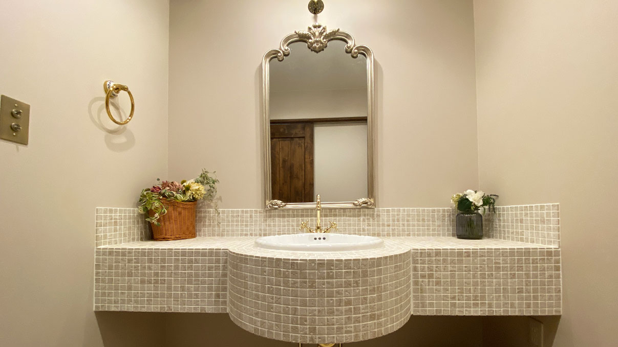 タイルの洗面台は毎日の身支度がワクワクするような仕上がりに♪
